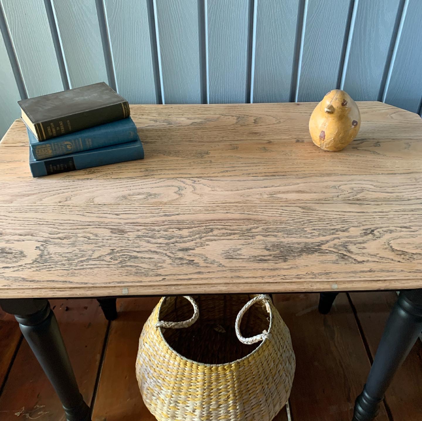 Take this beautiful desk/console home today! The top has been stripped down and left natural. The legs and apron, painted in a beautiful black. The quality of this piece is undeniable! Can be used as a desk, front foyer console, or even a dining table for a small space. Dimensions are 42Wx26Lx30H